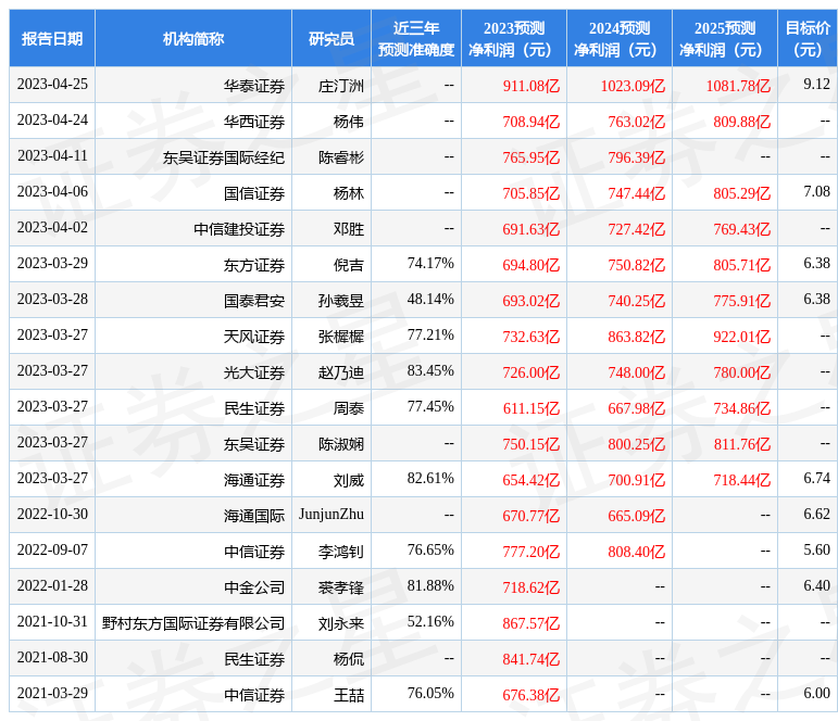 证券之星数据中心根据近三年发布的研报数据计算,光大证券赵乃迪研究员团队对该股研究较为深入,近三年预测准确度均值高达83.45%,其预测2023年度归属净利润为盈利726亿,根据现价换算的预测PE为11。